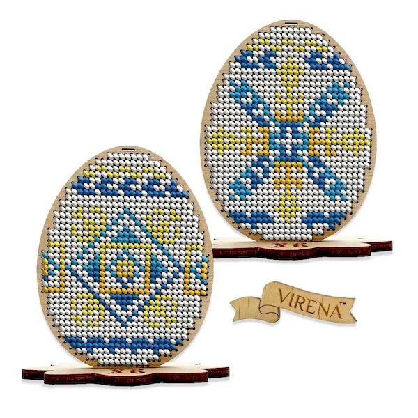 Склад комплекту: фанерна заготовка яйця та підставка, атласна стрічка, інструкція двосторонньої вишивки бісером, вкладка з зображенням декору, бісер