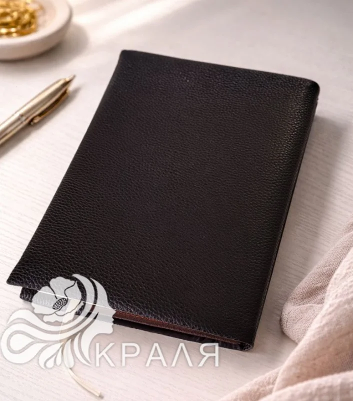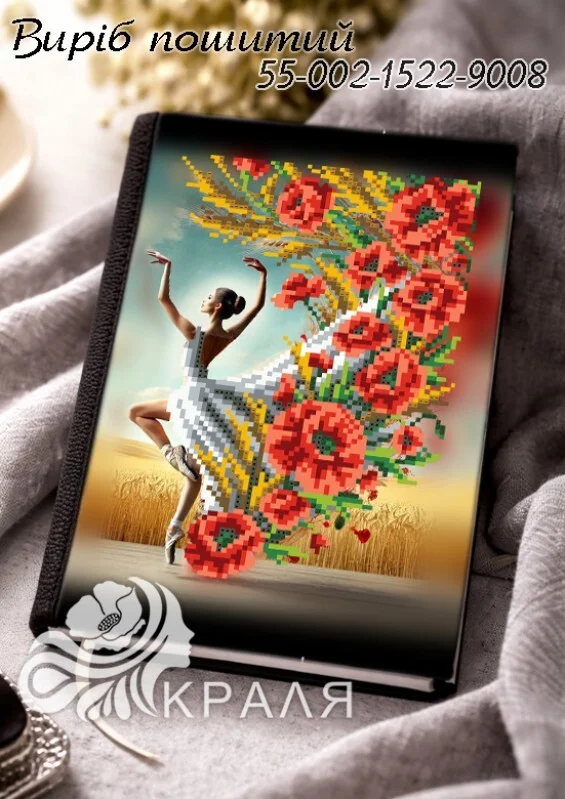 Матеріал обкладинки - чорна екошкіра, зона вишивки - габардин з нанесеним малюнком, всередині підкладка.