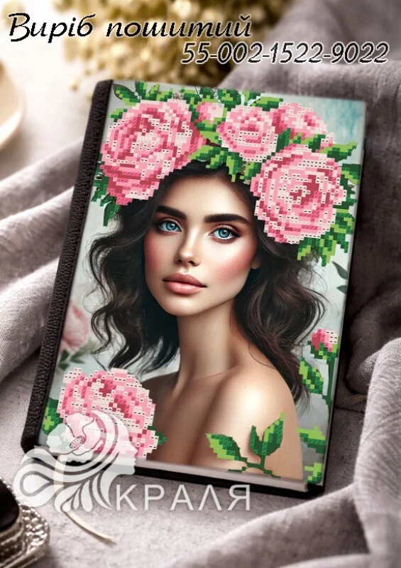 Матеріал обкладинки - чорна екошкіра, зона вишивки - габардин з нанесеним малюнком, всередині підкладка.