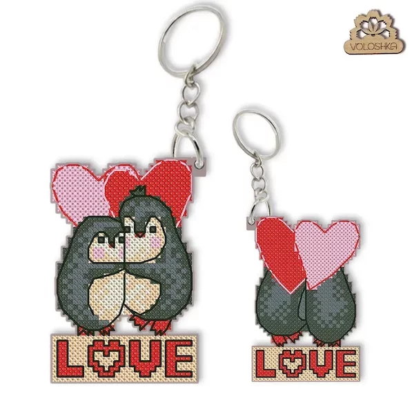 Брелок для вишивки хрестиком на пластиковій канві "Солодка парочка: Пінгвіни", VPC_053