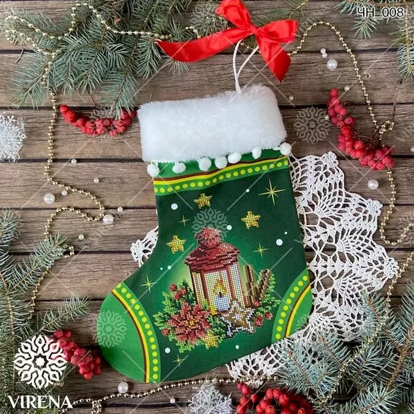 Основна тканина габардин, проклеєний флізеліном. Чобіток оздоблений штучним хутром з помпонами. Чобіток повністю зшитий і не потребує додаткової роботи по зшиванню. Малюнок водостійкий. Схема чітка з насиченими кольорами та високою якістю друку.