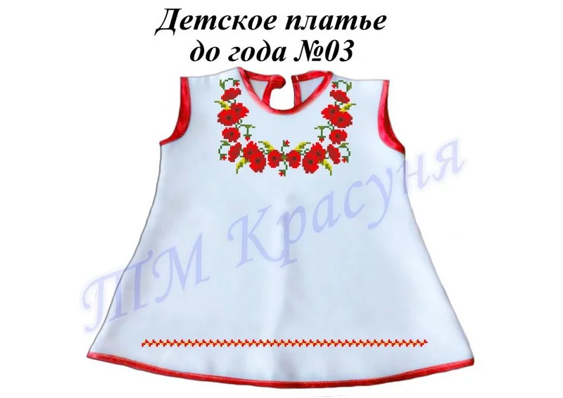 Пошита сукня для дівчинки до року. На заготовку нанесено малюнок у вигляді клітинок по яким потрібно вишивати бісером. Матеріал домоткане полотно. Пареметри сукні: довжина 38-40 см, ширина в районі пройми 29-30 см.
