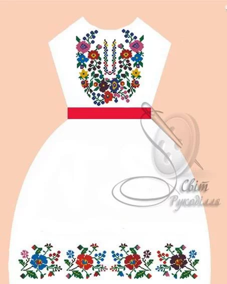 Заготовка під вишивку дитячої сукні зі стрічкою. Заготовка НЕ ПОШИТА. Вона складається з прямокутних відрізків тканини, які після вишивки необхідно розкроїти та сшити по своєму фасону і розміру. Розміри відрізків на заготовку - 50х45 см - два відрізки на верхню частину сукні, 50х60 см - два відрізки на низ сукні. Орієнтовно сукня розрахована для пошиття на дівчаток 4-12 років