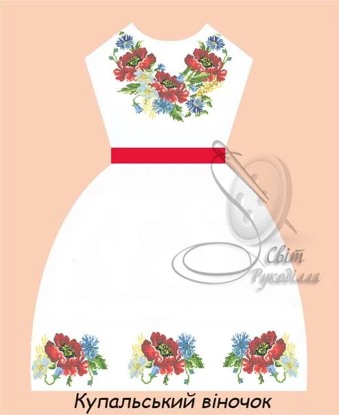 Заготовка під вишивку дитячої сукні зі стрічкою. Заготовка НЕ ПОШИТА. Вона складається з прямокутних відрізків тканини, які після вишивки необхідно розкроїти та сшити по своєму фасону і розміру. Розміри відрізків на заготовку - 50х45 см - два відрізки на верхню частину сукні, 50х60 см - два відрізки на низ сукні. Орієнтовно сукня розрахована для пошиття на дівчаток 4-12 років