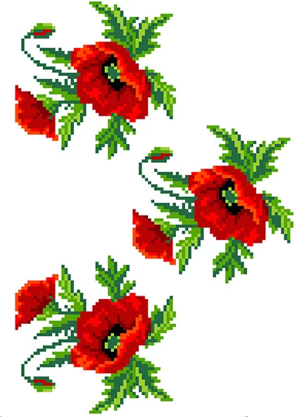 Фрагмент для вишивки. Виріжте орнамент, прикріпіть його до тканини за допомогою голки з ниткою і вишивайте бісером або нитками (хрестиком). Після вишивання замочіть виріб у мильному розчині - флізелін розчинеться, а вишивка лишиться. Орнамент можна використовувати для вишивання будь-яких текстильних виробів: сорочки, блузки, спідниці, брюки, та багато іншого.