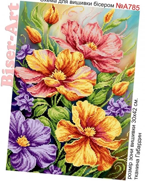 Схема під вишивку бісером. Друк на габардині. Розмір 30х42 см. До схеми додається список рекомендованих кольорів бісеру.