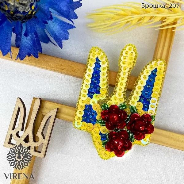 У набір входять: надрукована на фетрі схема вишивки та задня сторона брошки, булавка, бісер, бусини, нитки, голки та інші потрібні матеріали.
