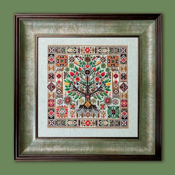 У дизайні використано мотив дерева як символу життя, роду, сили та безперервності поколінь, який здавна вважається оберегом і знаком гармонії. Орнамент доповнений геометричними та етнічними елементами, натхненними українською вишивальною традицією, що надає роботі глибокого змісту та автентичного характеру. Завдяки цьому сюжет виглядає актуально і водночас позачасово, органічно вписуючись як у класичний інтер’єр, так і в сучасний дизайн.
