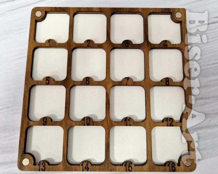 Розмір органайзера 15х15 см, має 16 пронумерованих комірок.