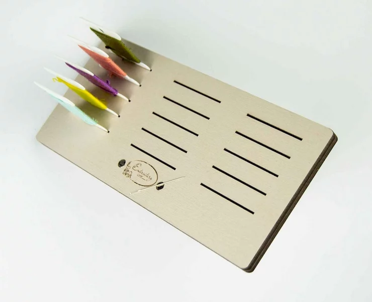 Підставка для бобін (шпуль) з магнітом для голок Розмір, мм(ШхВ): 18*8 Кількість прорізів: 15 Матеріал: Фанера Виробник: “Embroidery Craft”