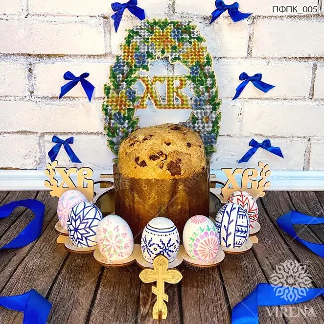 Оригінальна святкова декоративна підставка на якій зручно розмістити освячену паску та крашанки. Така підставка стане яскравою окрасою святкового столу та подарує незабутні враження від процесу вишивки. Наповнить святковим настроєм ваш дім та серце.