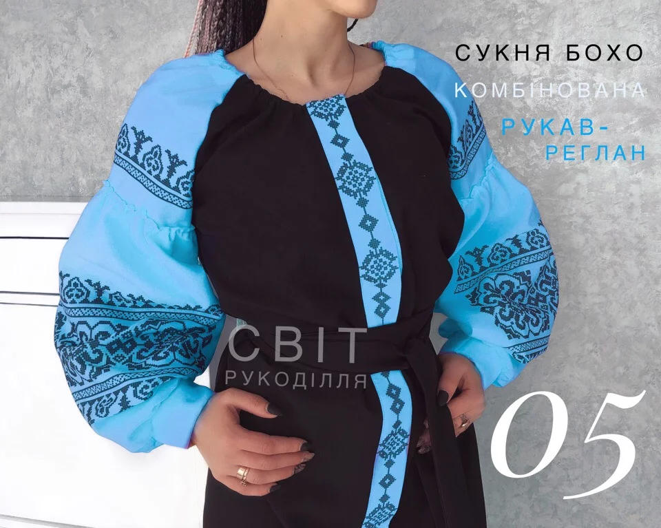 Пошита заготовка під вишивку сукні. Представлені фото, є прикладами можливих варіантів пошиття суконь, ви можете обирати тканину і колір із запропонованих на свій смак. При виборі комбінації кольорів потрібно враховувати те, що на темних тканинах друку немає, тому на рукава слід обирати більш світлу тканину, щоб на ній було видно розмітку під вишивку. Також в пошитті сукні можлива похибка в 1-2 см від представлених параметрів в розмірній сітці. На фото сукня виконана на темно-сірому габардині