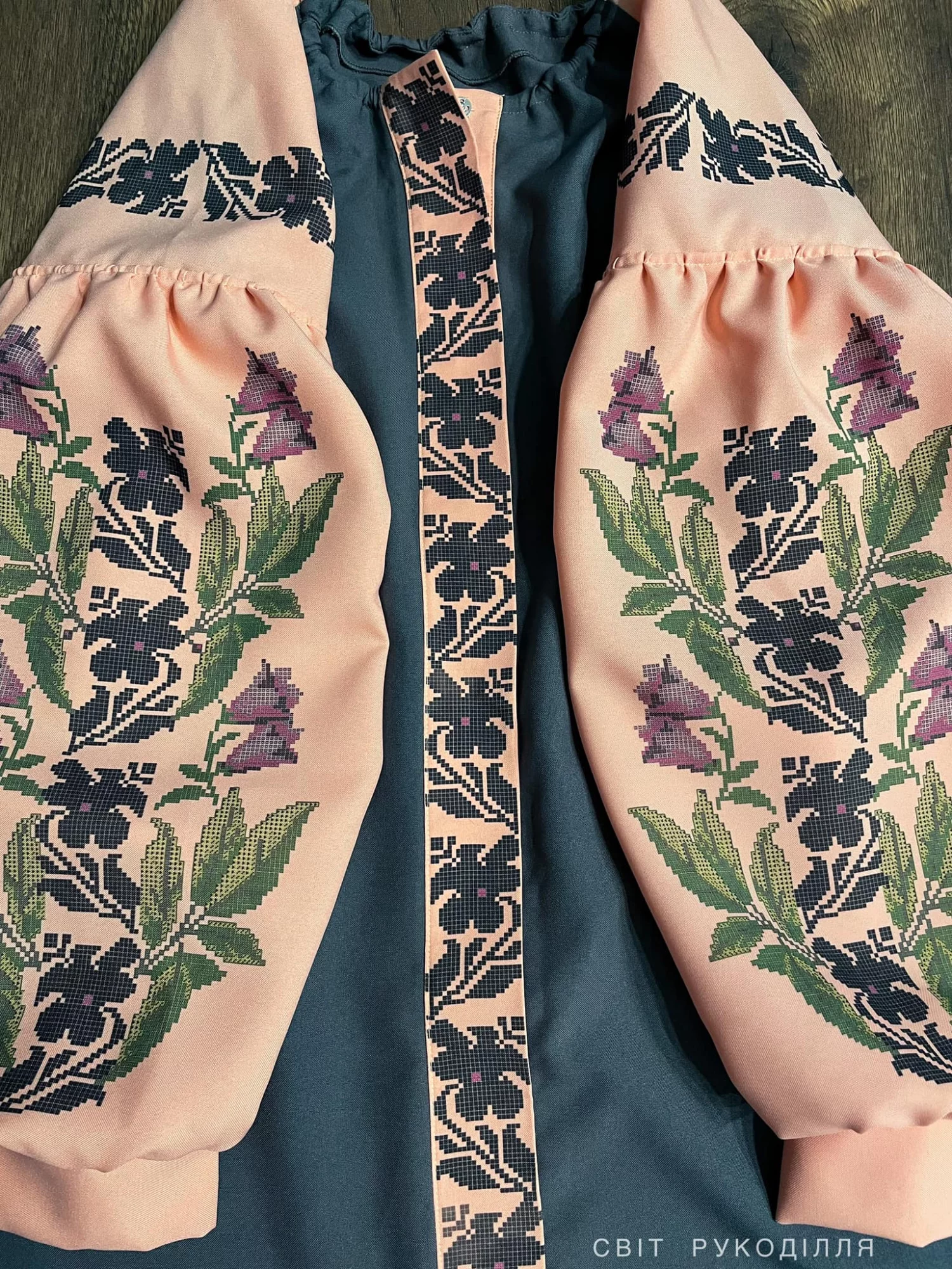 Пошита заготовка під вишивку сукні. Представлені фото, є прикладами можливих варіантів пошиття суконь, ви можете обирати тканину і колір із запропонованих на свій смак. При виборі комбінації кольорів потрібно враховувати те, що на темних тканинах друку немає, тому на рукава слід обирати більш світлу тканину, щоб на ній було видно розмітку під вишивку. Також в пошитті сукні можлива похибка в 1-2 см від представлених параметрів в розмірній сітці. На фото сукня виконана на темно-сірому габардині