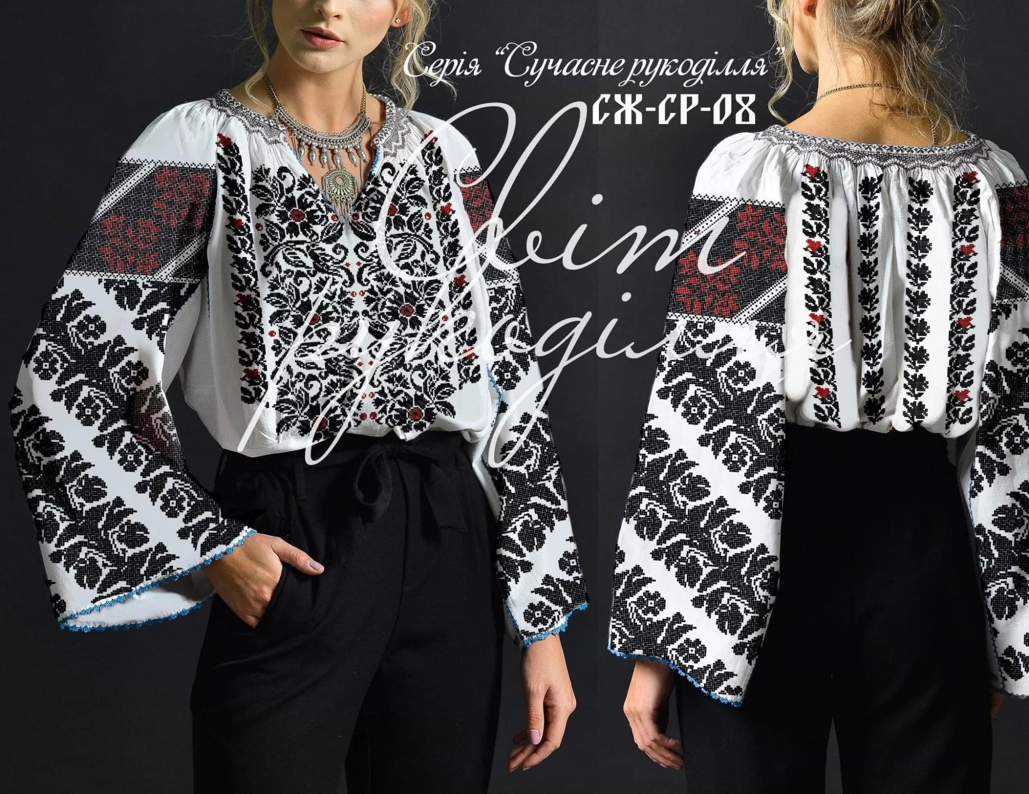 Не пошита сорочка під вишивку бісером або нитками. На заготовку нанесено малюнок у вигляді клітинок по яким необхідно вишивати бісером або нитками. Заготовка складається з прямокутних відрізків тканини, які після вишивки потрібно розкроїти та сшити по своєму фасону та фігурі.