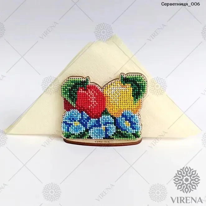 Придбавши серветницю ви отримаєте дві бічні стінки та основу, також серветниця комплектується фігурними фетровими пластинами для декорування звороту вишивки та вкладкою з надрукованою схемою (на вкладці зображена схема та розкладка бісеру)