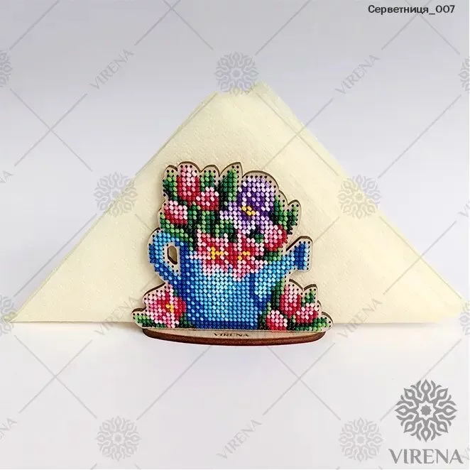 Придбавши серветницю ви отримаєте дві бічні стінки та основу, також серветниця комплектується фігурними фетровими пластинами для декорування звороту вишивки та вкладкою з надрукованою схемою (на вкладці зображена схема та розкладка бісеру)