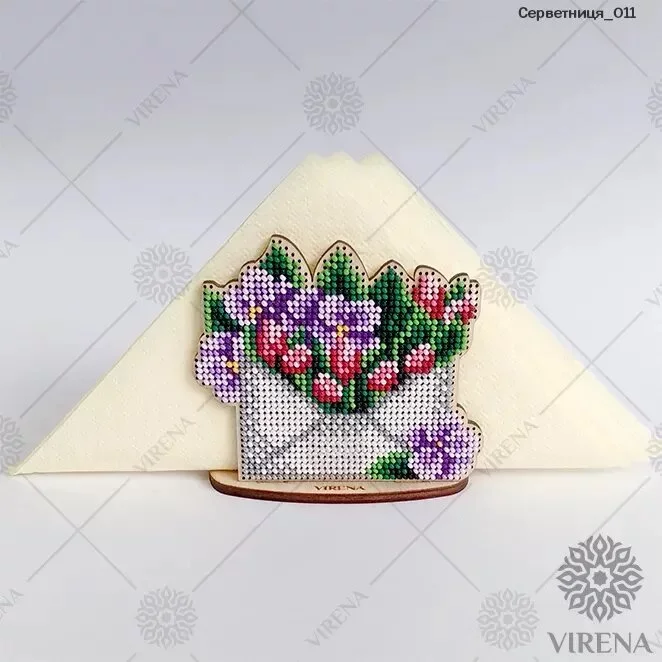 Придбавши серветницю ви отримаєте дві бічні стінки та основу, також серветниця комплектується фігурними фетровими пластинами для декорування звороту вишивки та вкладкою з надрукованою схемою (на вкладці зображена схема та розкладка бісеру)