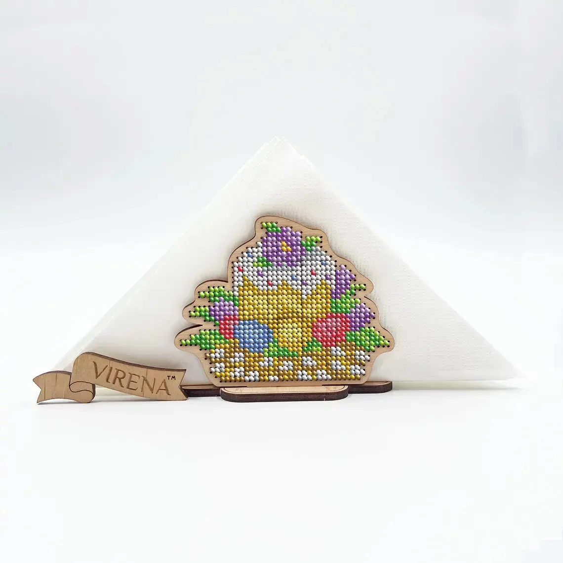 Придбавши серветницю ви отримаєте дві бічні стінки та основу, також серветниця комплектується фігурними фетровими пластинами для декорування звороту вишивки та вкладкою з надрукованою схемою (на вкладці зображена схема та розкладка бісеру)