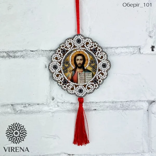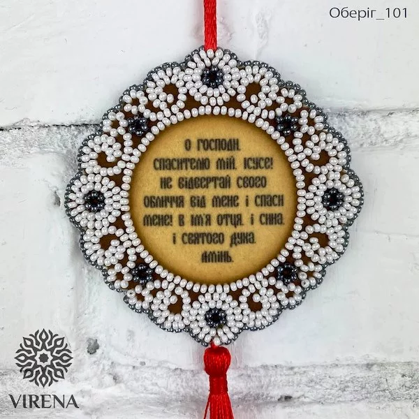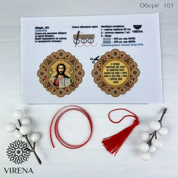 Схема оберегу нанесена на фетрову основу. З однієї сторони зображена ікона, а з іншої — молитва.