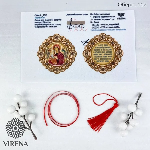 Схема оберегу нанесена на фетрову основу. З однієї сторони зображена ікона, а з іншої — молитва.