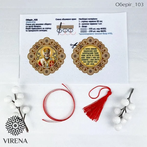 Схема оберегу нанесена на фетрову основу. З однієї сторони зображена ікона, а з іншої — молитва.