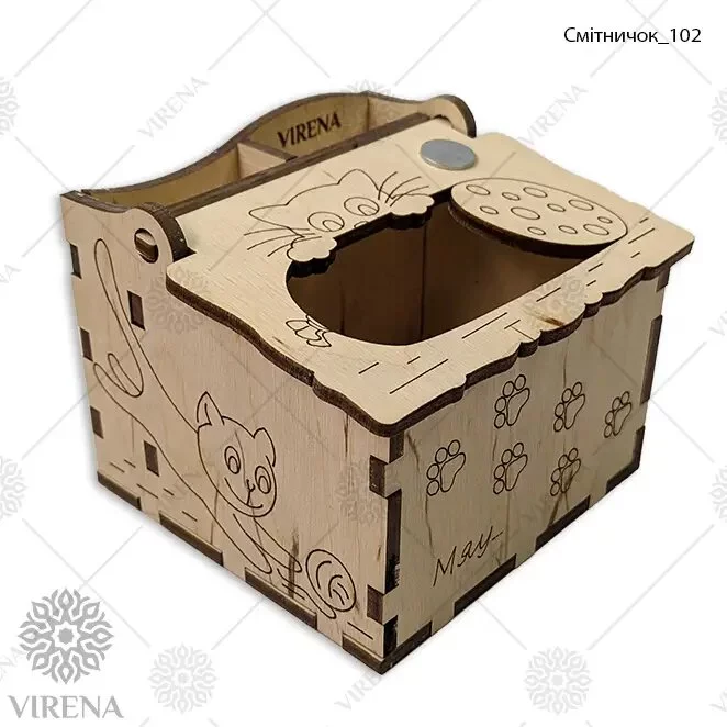 За допомогою цього набору ви зробите зручний смітничок для рукодільного сміття з заднім відсіком під ножиці, ручки або інші рукодільне приладдя.