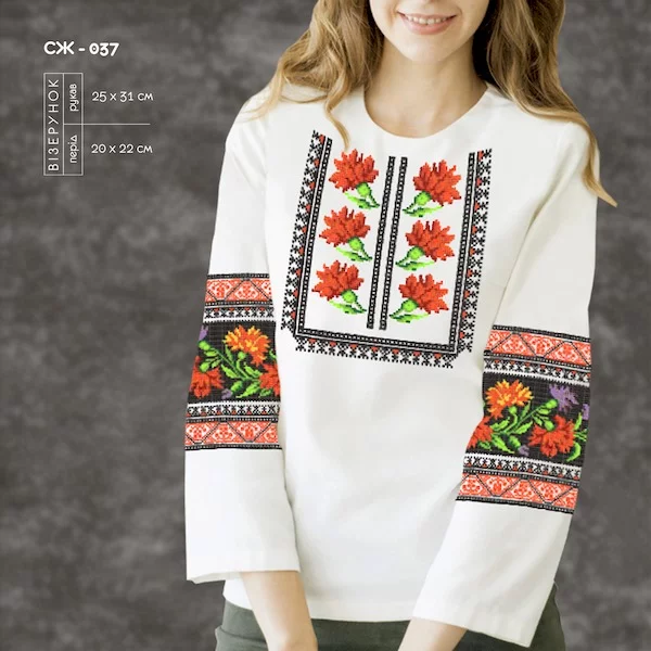 - на чорній (темній) тканині малюнок не наноситься. Малюнок друкується на водорозчинному флізеліні, який додається у комплект. Ціна заготовки не змінюється, але вишивати менш зручно.