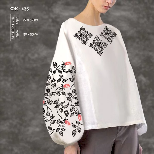 - на чорній (темній) тканині малюнок не наноситься. Малюнок друкується на водорозчинному флізеліні, який додається у комплект. Ціна заготовки не змінюється, але вишивати менш зручно.