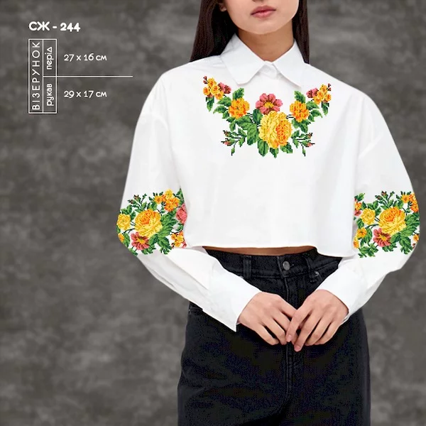 - на чорній (темній) тканині малюнок не наноситься. Малюнок друкується на водорозчинному флізеліні, який додається у комплект. Ціна заготовки не змінюється, але вишивати менш зручно.