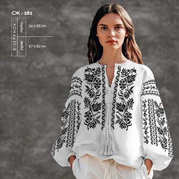 - на чорній (темній) тканині малюнок не наноситься. Малюнок друкується на водорозчинному флізеліні, який додається у комплект. Ціна заготовки не змінюється, але вишивати менш зручно.