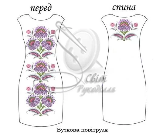 Заготовка під вишивку сукні. Заготовка НЕ ПОШИТА. Вона складається з прямокутних відрізків тканини, які після вишивки необхідно розкроїти та сшити по своєму фасону і розміру. Розміри відрізків на заготовку - 75х115 см - 2 шт (на перед і спинку) для габардину і 70х115 см -2 шт, для домотканого полотна. На темних тканинах друку немає! (До тканини додається водорозчинний флізелін з надрукованою схемою). Будь ласка, в коментарях до замовлення вказуйте бажаний колір тканини.