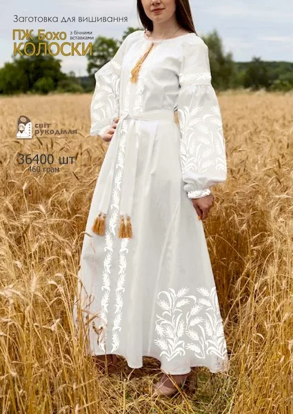 Не пошита сукня під вишивку бісером. На заготовку нанесено малюнок у вигляді клітинок по яким потрібно вишивати бісером або нитками. Сукня складається з прямокутних відрізків тканини, які після вишивки потрібно розкроїти та сшити по своєму фасону та фігурі.