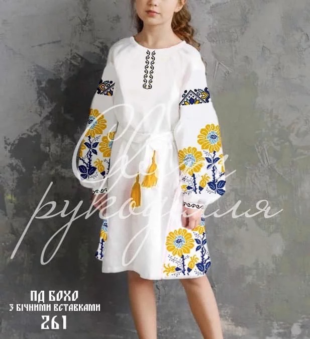 Заготовка під вишивку сукні. Заготовка НЕ ПОШИТА. Вона складається з прямокутних відрізків тканини, які після вишивки необхідно розкроїти та сшити по своєму фасону і розміру. Розміри відрізків на заготовку - 60х100 см -2 шт (перед і спинка), рукава 50х60 см-2 шт, бічні вставки 50х60 см -2 шт. Для домтканого полотна параметри відрізків інші: 60х90 см - 2 відрізки на перед і спинку; рукава: 45х60 см -2 шт; бічні вставки - 45х60 см - 2 шт. На темних тканинах друку немає! (До тканини додається водорозчинний флізелін з надрукованою схемою). Будь ласка, в коментарях до замовлення вказуйте бажаний колір тканини.