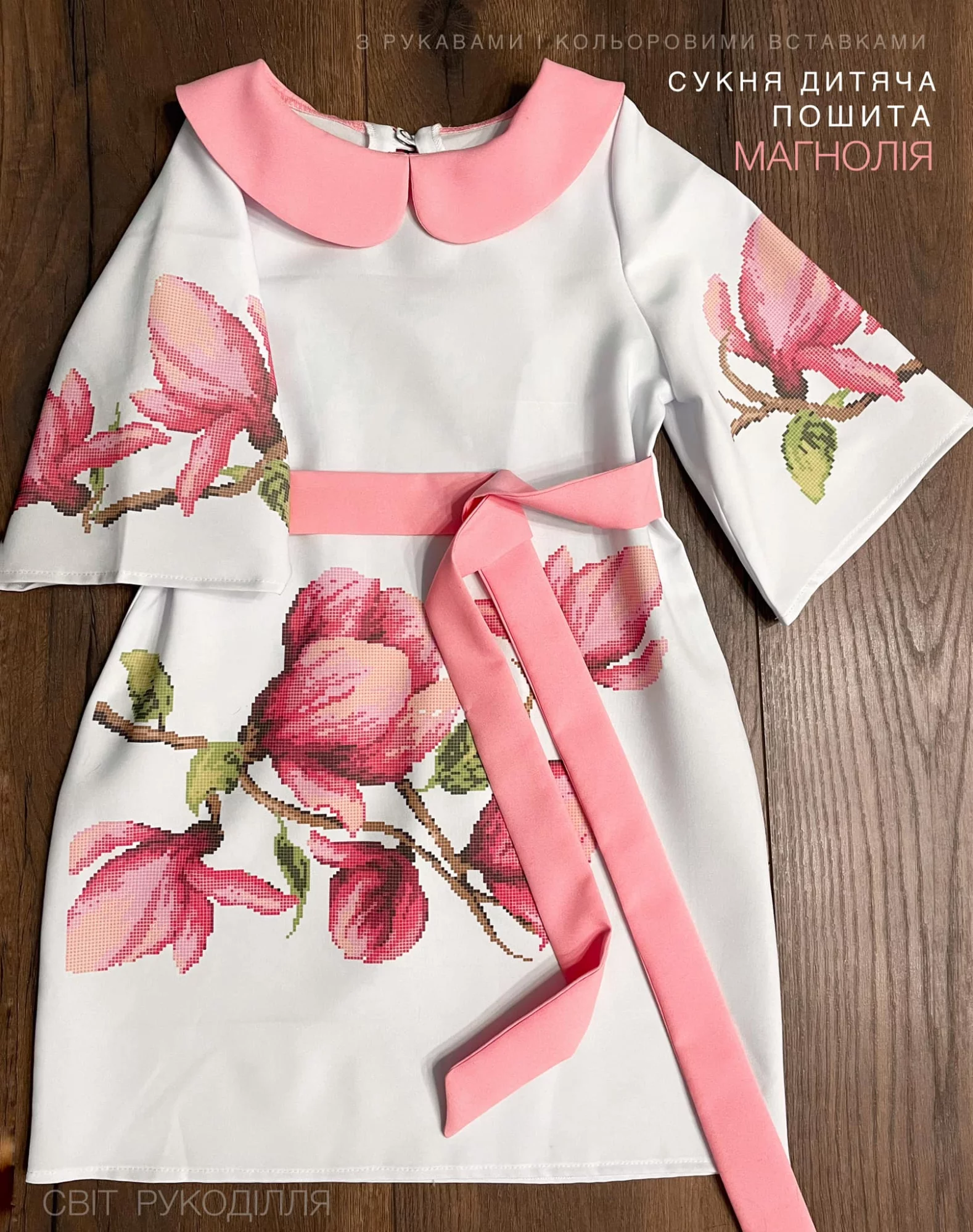 Пошита сукня під вишивку бісером. Матеріал сукні - білий і рожевий габардин. Після вишивки сукня не потребує додаткових дій по зшиванню. Зверніть увагу! При пошитті можлива похибка в 1-2 см. Будь ласка, перед замовленням звіряйтесь з розмірною сіткою виробника.