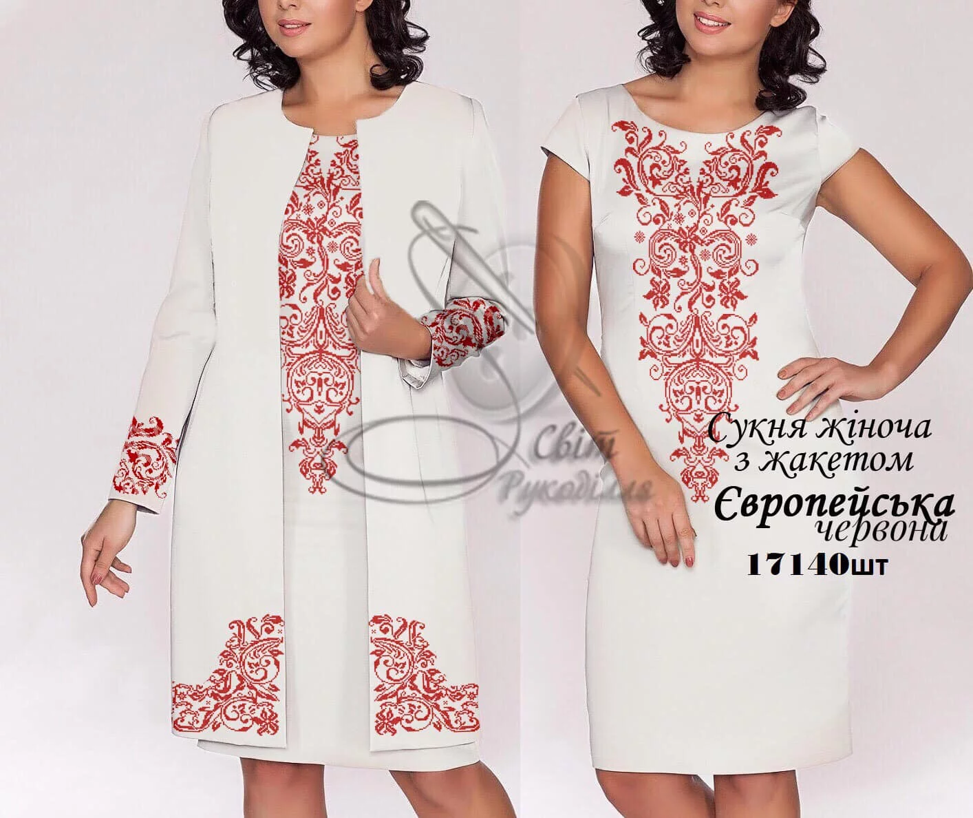 Заготовка під вишивку сукні з жакетом. Заготовка НЕ ПОШИТА і не розкроєна. Після вишивки ва потрібно буде самостійно розкроїти і сшити виріб за своїм розміром та фасоном. Розмір відрізків на заготовку: сукня - 75х115 см - 2 відрізки на перед і спинку (параметри для домотканого полотна 70х115 см), відрізки тканини на жакет 75х115 см на перед і спинку (домоткане 70х115 см), рукава 60х75 см - 2 відрізки (домоткане 60х70 см). На темних тканинах друку немає! (До тканини додається водорозчинний флізелін з надрукованою схемою). Будь ласка, в коментарях до замовлення вказуйте бажаний колір тканини.