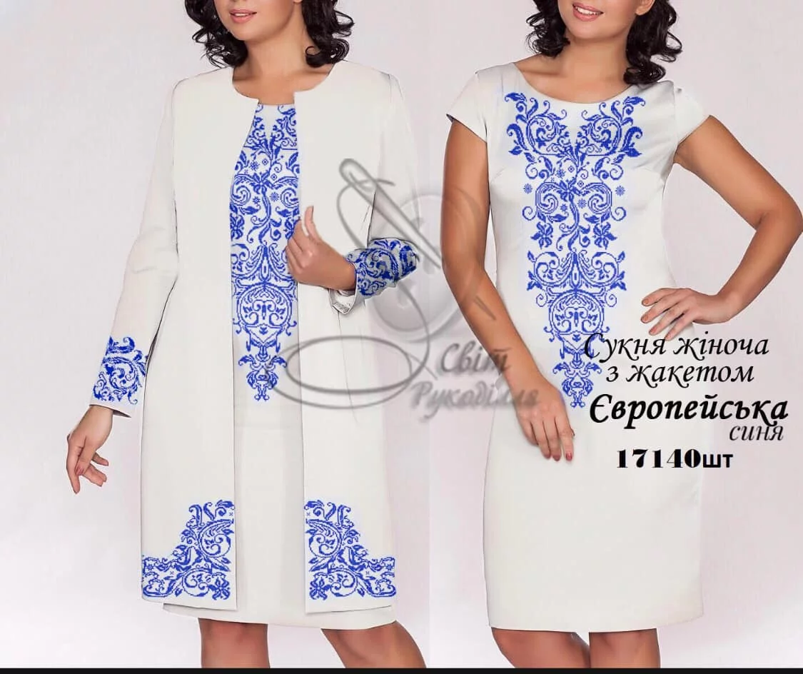 Заготовка під вишивку сукні з жакетом. Заготовка НЕ ПОШИТА і не розкроєна. Після вишивки ва потрібно буде самостійно розкроїти і сшити виріб за своїм розміром та фасоном. Розмір відрізків на заготовку: сукня - 75х115 см - 2 відрізки на перед і спинку (параметри для домотканого полотна 70х115 см), відрізки тканини на жакет 75х115 см на перед і спинку (домоткане 70х115 см), рукава 60х75 см - 2 відрізки (домоткане 60х70 см). На темних тканинах друку немає! (До тканини додається водорозчинний флізелін з надрукованою схемою). Будь ласка, в коментарях до замовлення вказуйте бажаний колір тканини.