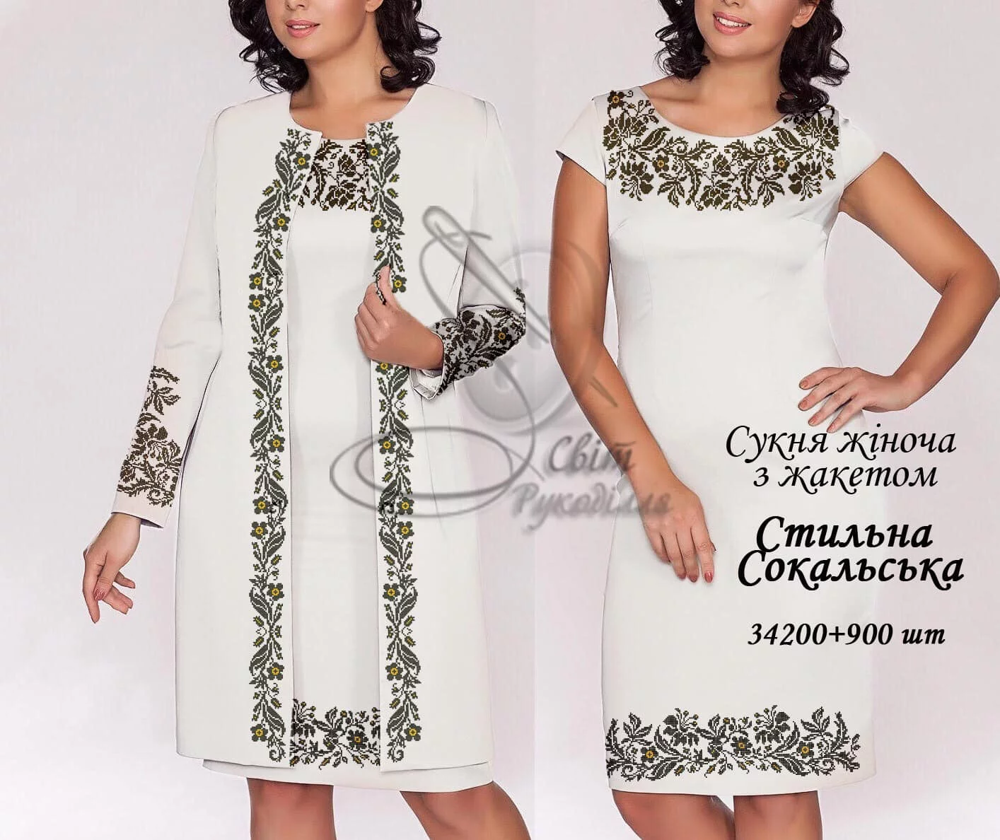 Заготовка під вишивку сукні з жакетом. Заготовка НЕ ПОШИТА і не розкроєна. Після вишивки ва потрібно буде самостійно розкроїти і сшити виріб за своїм розміром та фасоном. Розмір відрізків на заготовку: сукня - 75х115 см - 2 відрізки на перед і спинку (параметри для домотканого полотна 70х115 см), відрізки тканини на жакет 75х115 см на перед і спинку (домоткане 70х115 см), рукава 60х75 см - 2 відрізки (домоткане 60х70 см). На темних тканинах друку немає! (До тканини додається водорозчинний флізелін з надрукованою схемою). Будь ласка, в коментарях до замовлення вказуйте бажаний колір тканини.