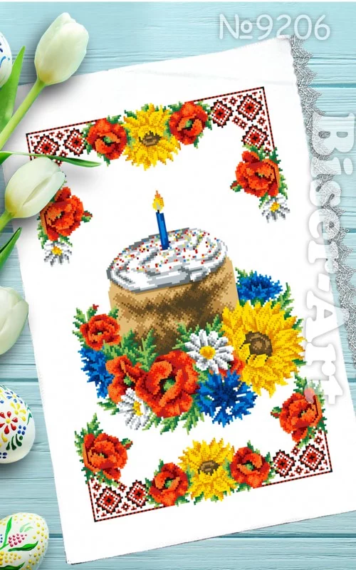 Заготовка під вишивку рушничка на великодній кошик. Розмір заготовки 30х50 см. До схеми додається список рекомендованих кольорів бісеру.