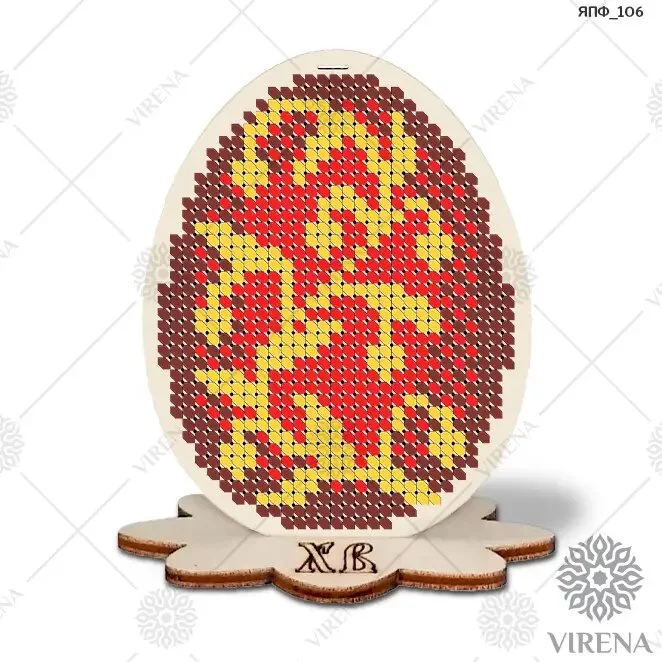 Склад комплекту: фанерна заготовка яйця та підставка, атласна стрічка, інструкція двосторонньої вишивки бісером, вкладка з зображенням декору, бісер