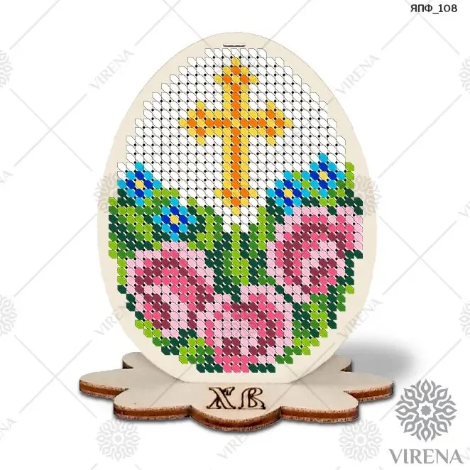 Склад комплекту: фанерна заготовка яйця та підставка, атласна стрічка, інструкція двосторонньої вишивки бісером, вкладка з зображенням декору, бісер