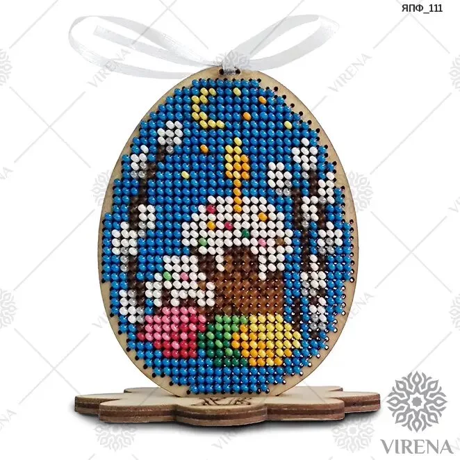 Склад комплекту: фанерна заготовка яйця та підставка, атласна стрічка, інструкція двосторонньої вишивки бісером, вкладка з зображенням декору, бісер