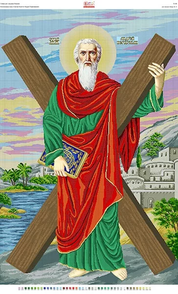 Картина для вишивки бісером ЕІ-09 Ексклюзивна ікона “Св. Апостол Андрій Первозваний» Тканина : Габардин Загальний розмір : 80*132,2 см Розмір кольорової частини: 80*124 см Зашивка : часткова Кількість кольорів: 42 шт Загальна кількість бісеру: 205160 шт