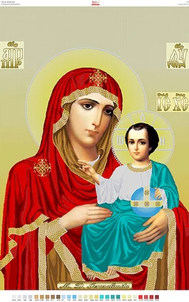 Картина для вишивки бісером ЕІ-10 Ексклюзивна ікона “МБ Ієрусалимська» Тканина : Габардин Загальний розмір : 190*120 см Розмір кольорової частини: 180*120 см Зашивка : часткова Кількість кольорів: 27 шт Загальна кількість бісеру: 478271 шт