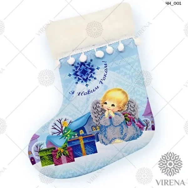 Основна тканина габардин, проклеєний флізеліном. Чобіток оздоблений штучним хутром з помпонами. Чобіток повністю зшитий і не потребує додаткової роботи по зшиванню. Малюнок водостійкий. Схема чітка з насиченими кольорами та високою якістю друку.