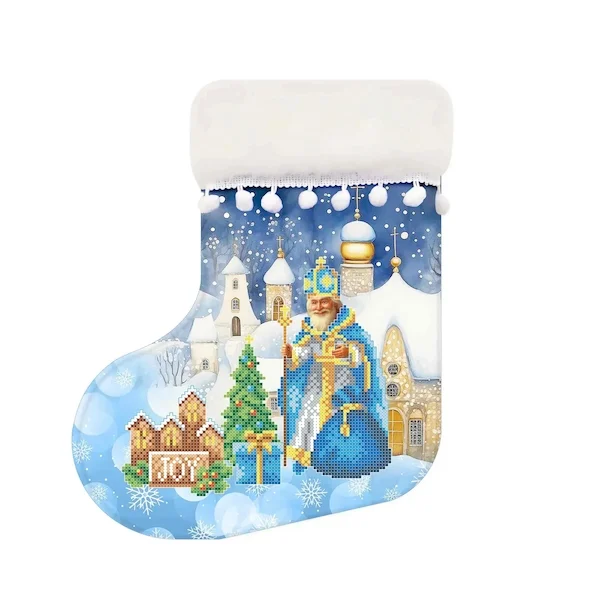Основна тканина габардин, проклеєний флізеліном. Чобіток оздоблений штучним хутром з помпонами. Чобіток повністю зшитий і не потребує додаткової роботи по зшиванню. Малюнок водостійкий. Схема чітка з насиченими кольорами та високою якістю друку.