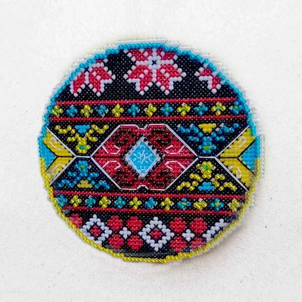 Іграшки мають передню та задню сторони. Після вишивання потрібно по контуру обрізати пластикову канву, скласти пластини виворітною стороною в середину і по контуру зшити.