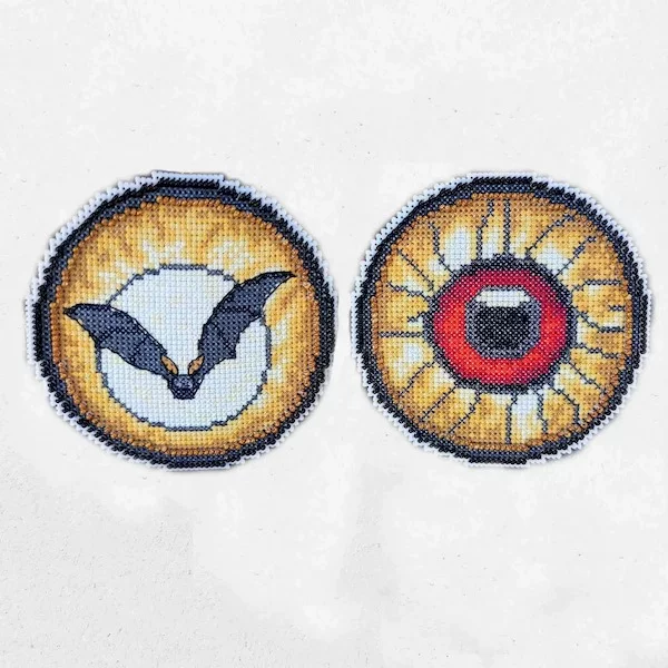 Іграшки мають передню та задню сторони. Після вишивання потрібно по контуру обрізати пластикову канву, скласти пластини виворітною стороною в середину і по контуру зшити.