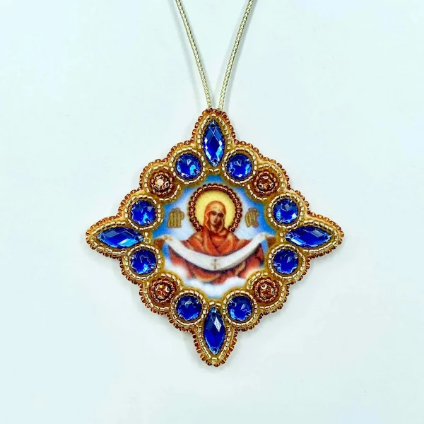 Схема оберегу нанесена на фетрову основу. З однієї сторони зображена ікона, а з іншої — молитва. Схема викладена криволінійною технікою.