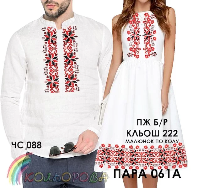 Комплект вишиванок для пар складається з чоловічої сорочки та плаття жіночого без рукавів кльош.