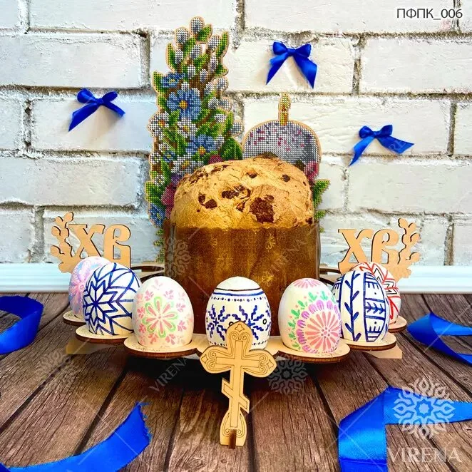 Оригінальна святкова декоративна підставка на якій зручно розмістити освячену паску та крашанки. Така підставка стане яскравою окрасою святкового столу та подарує незабутні враження від процесу вишивки. Наповнить святковим настроєм ваш дім та серце.